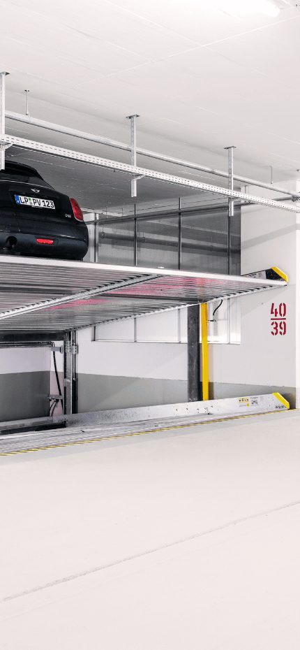 Dependant Parking | maximise vertical parking when pit installation isn’t possible. Parking system that stacks vehicles on platforms, requiring the bottom space to be clear for movement. Fits existing buildings, stacking up to three cars.