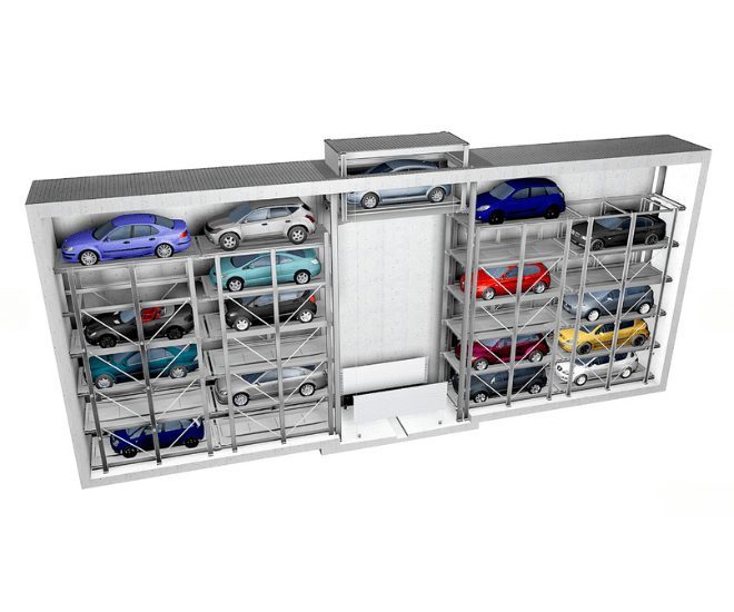 A centralized vertical conveyor stationed within the transfer zone efficiently transports vehicles to any of the 6 possible parking tiers per system