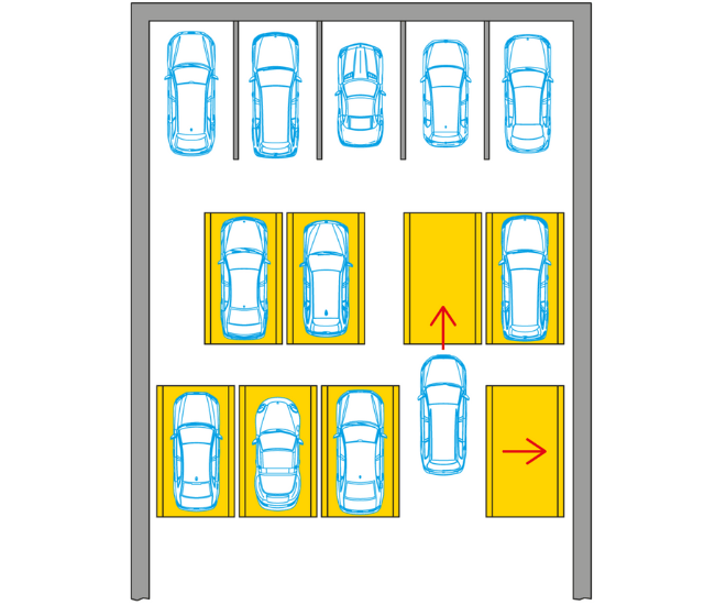 Single vacant space per row enables direct access to the selected parking position