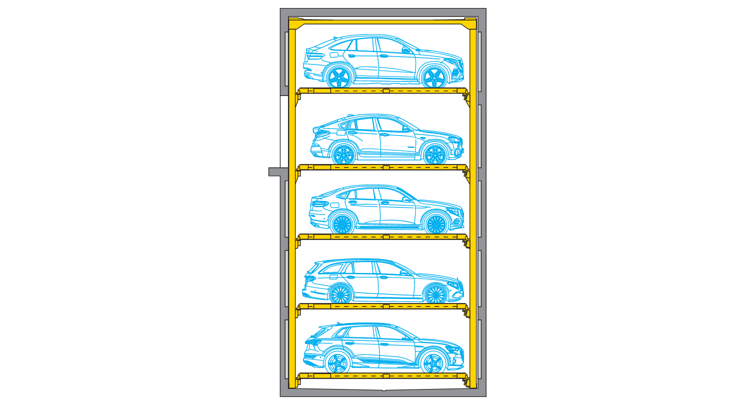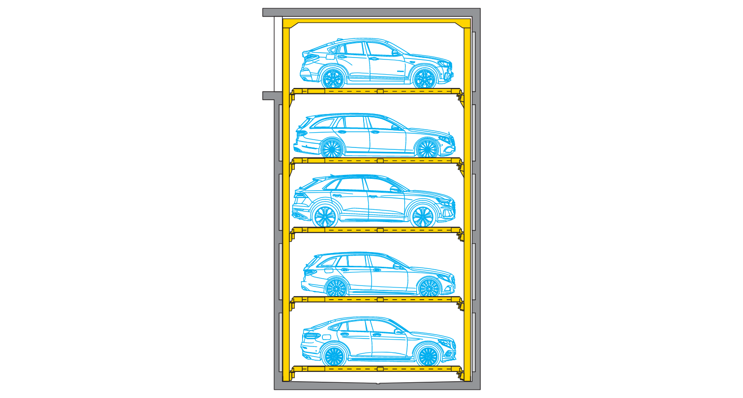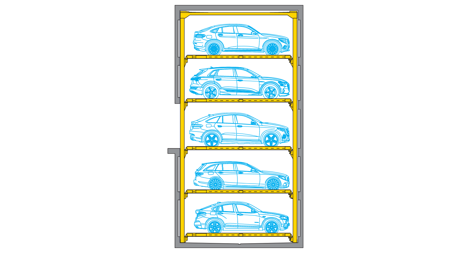 A truly impressive evolution of the ever-reliable Combilift 543 (three-level) systems: Up to 5 parking levels with the capability of 2-3 additional levels without increasing space usage