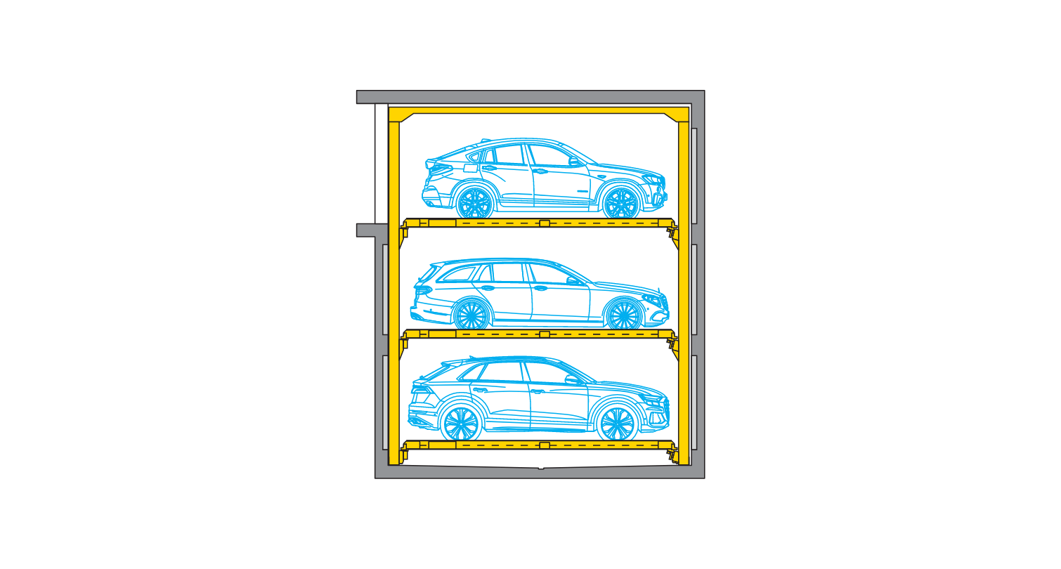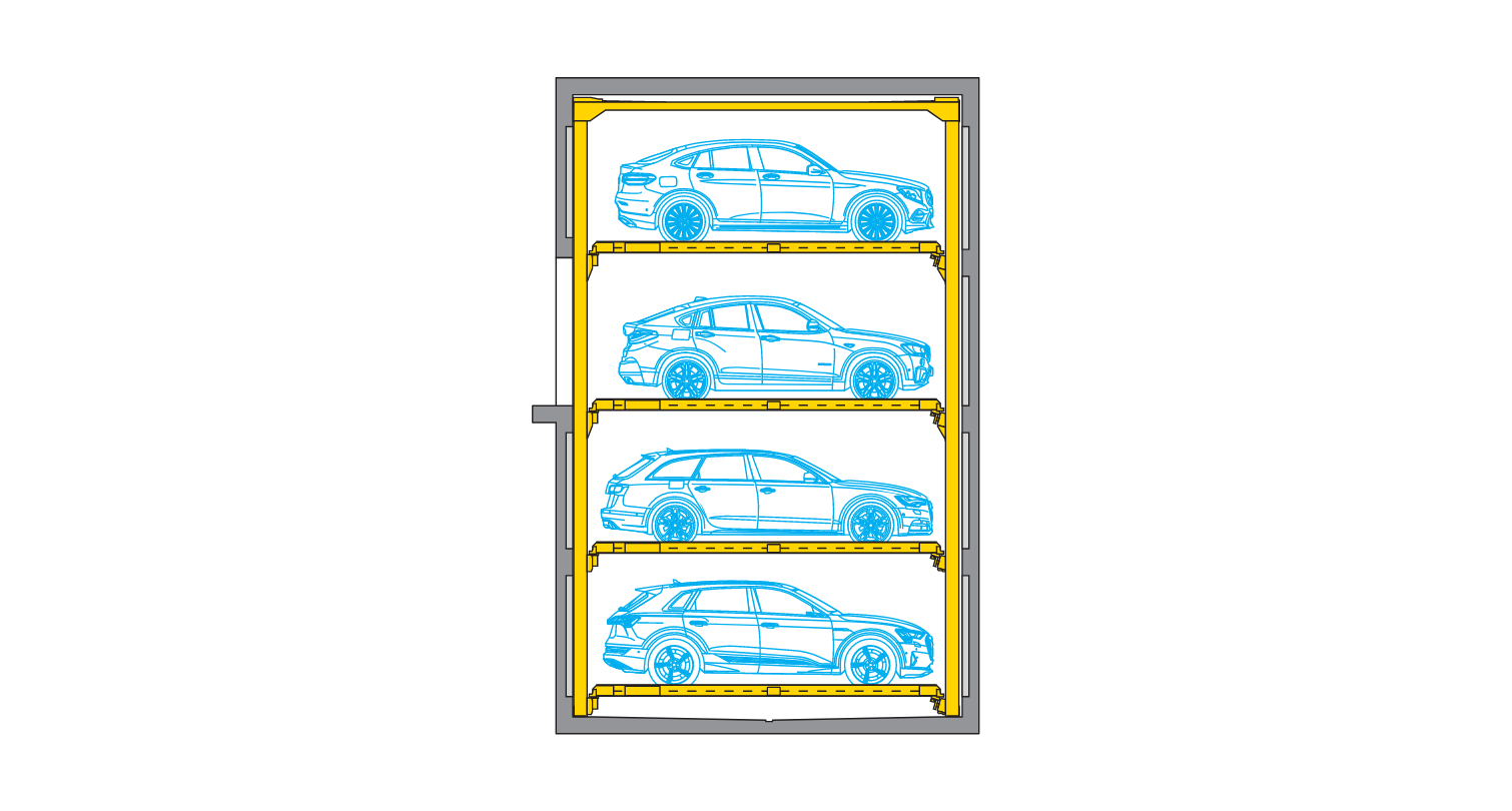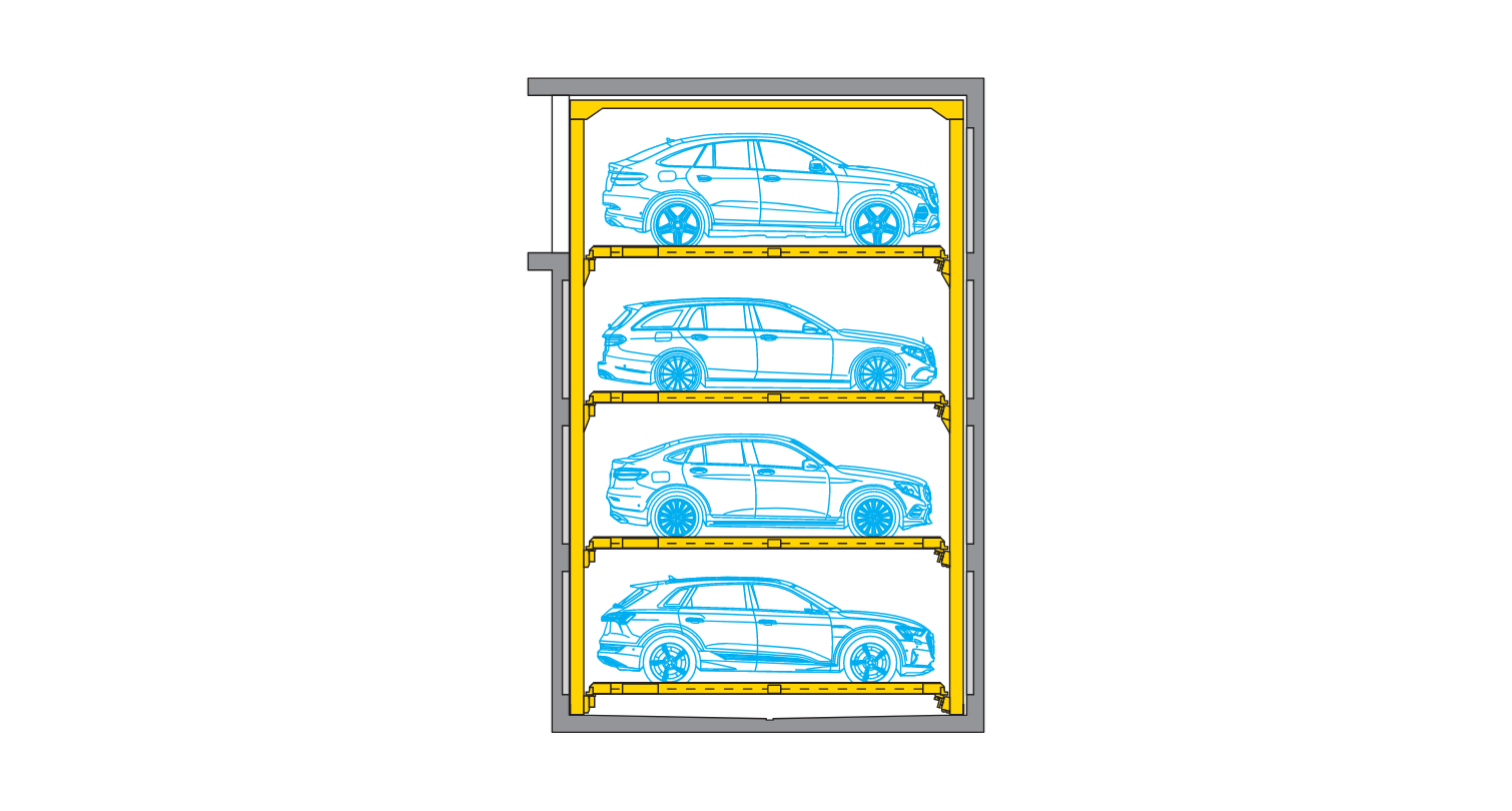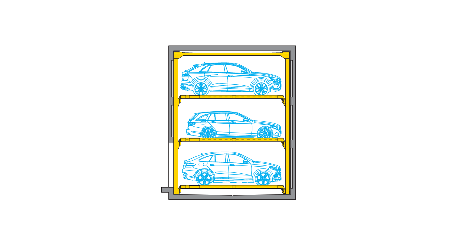 A truly impressive evolution of the ever-reliable Combilift 543 (three-level) systems: Up to 5 parking levels with the capability of 2-3 additional levels without increasing space usage