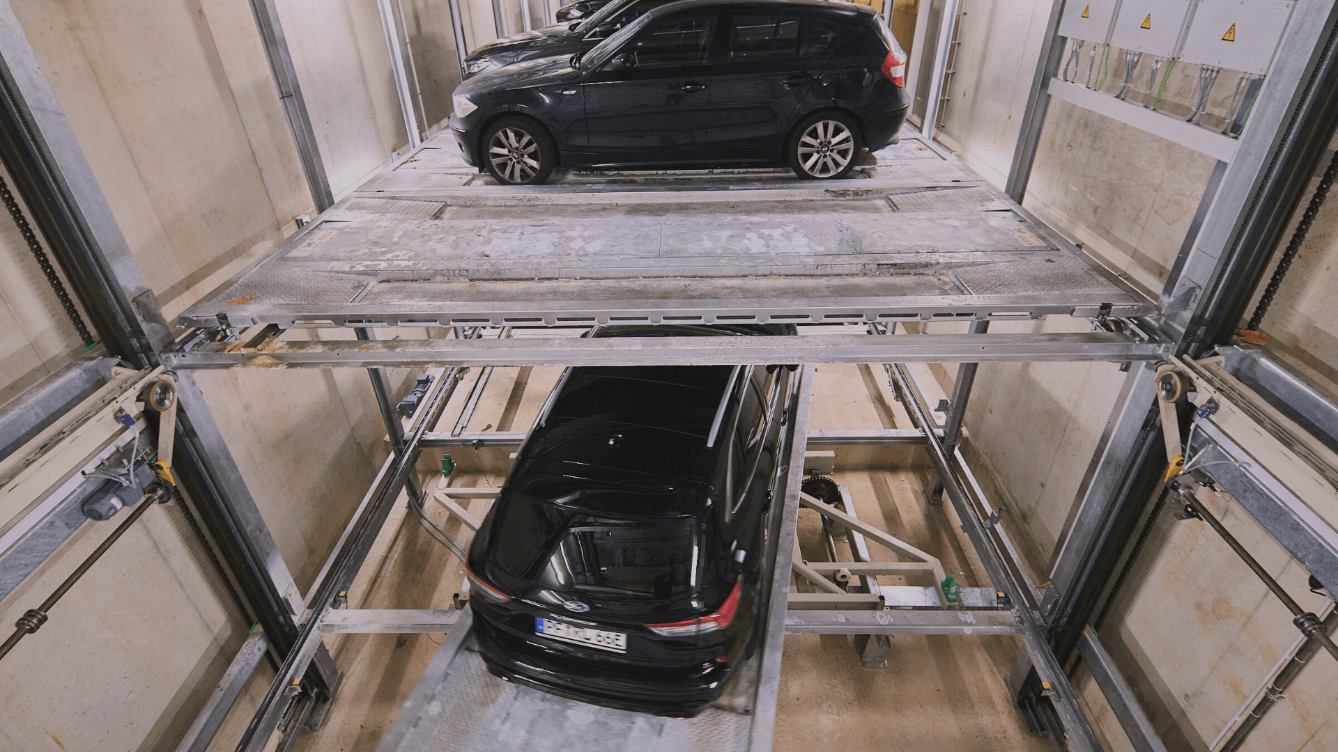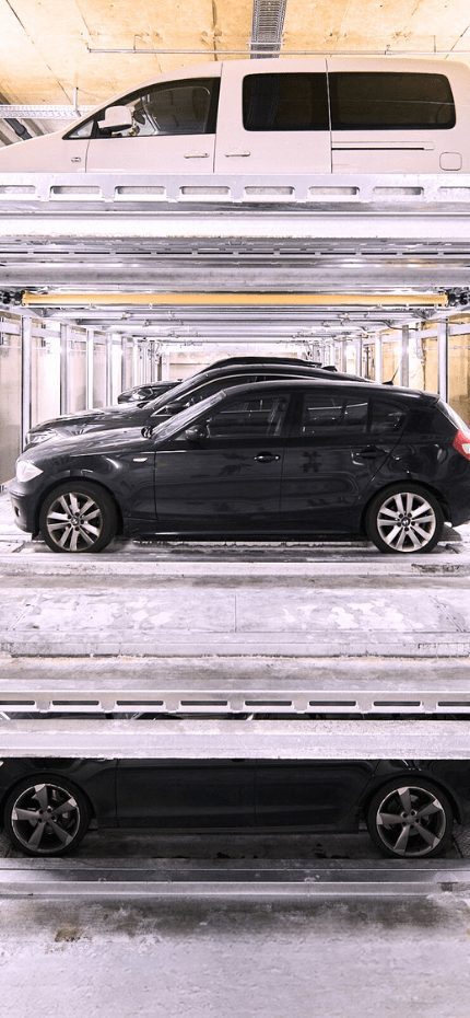 A space-saving parking system with single row arrangement on 2 to 5 parking levels, no need for ramps or driveways