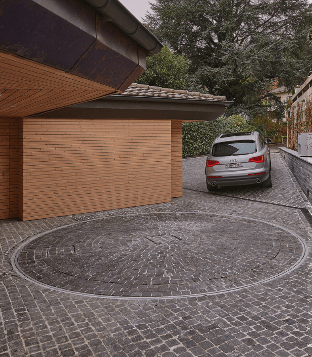 Turntable rotation constitutes the ideal solution in the event of narrow and limited parking space entries and exits