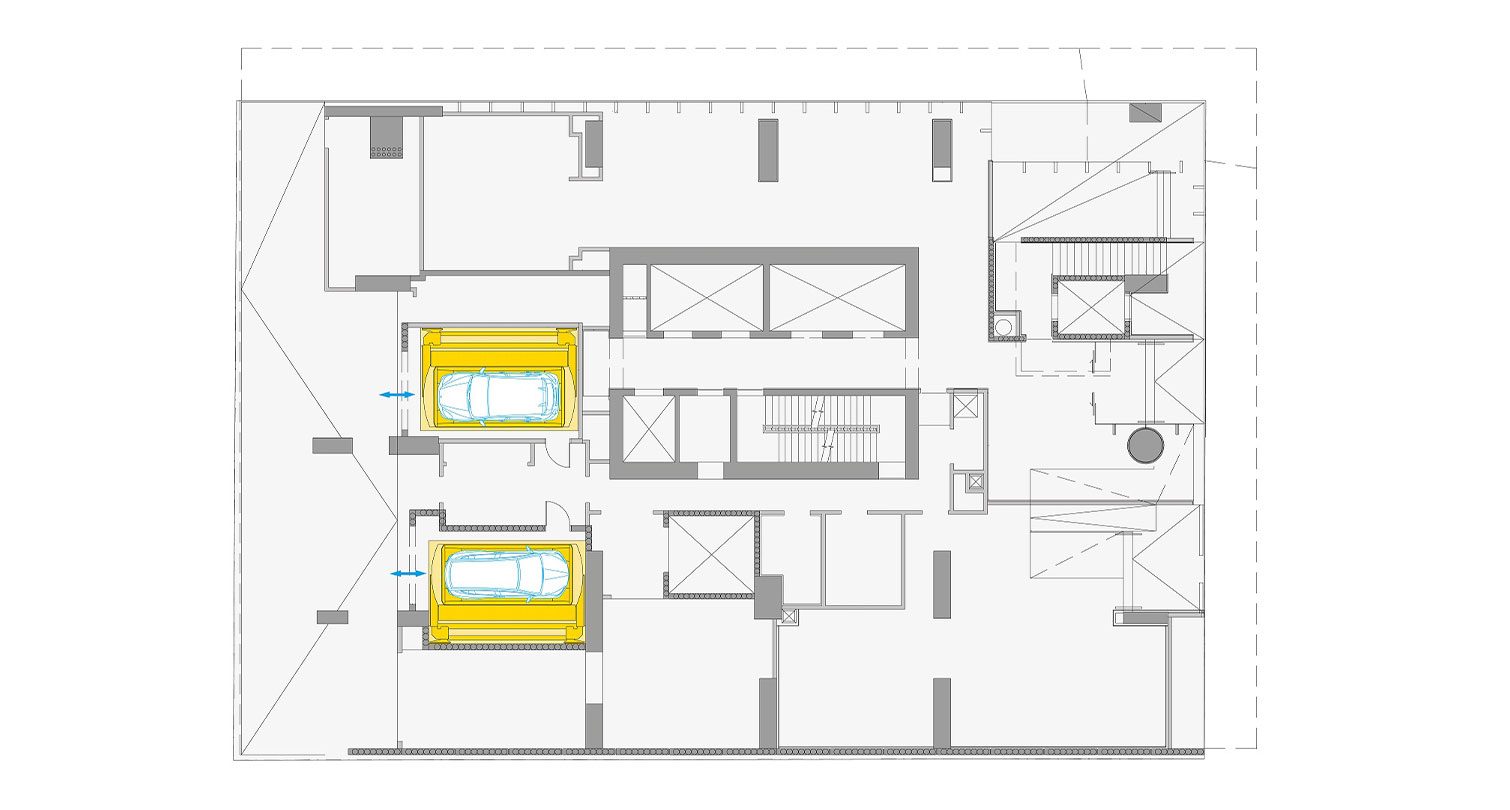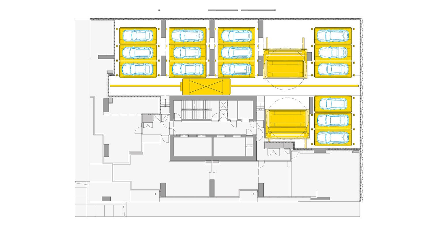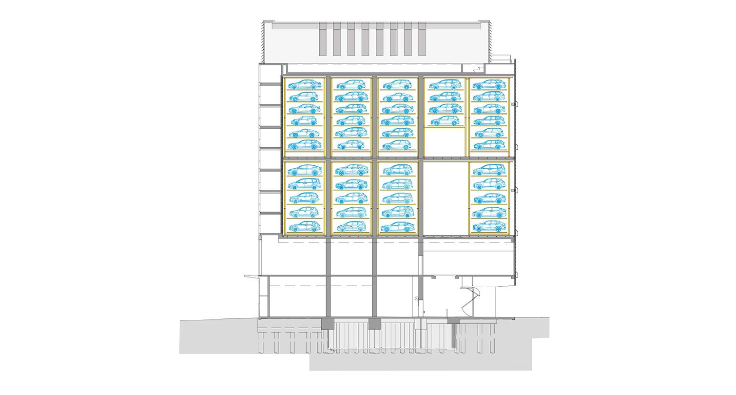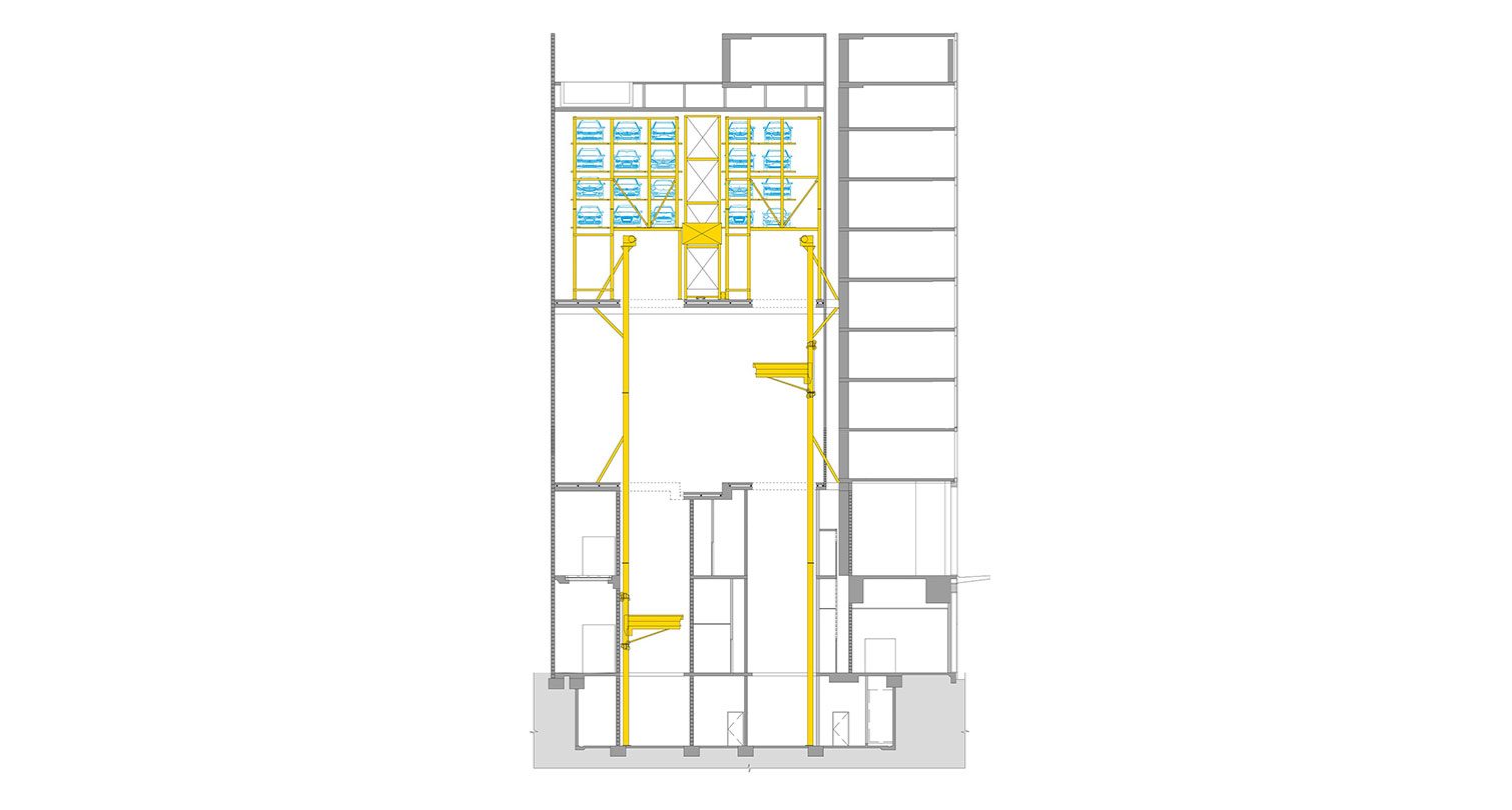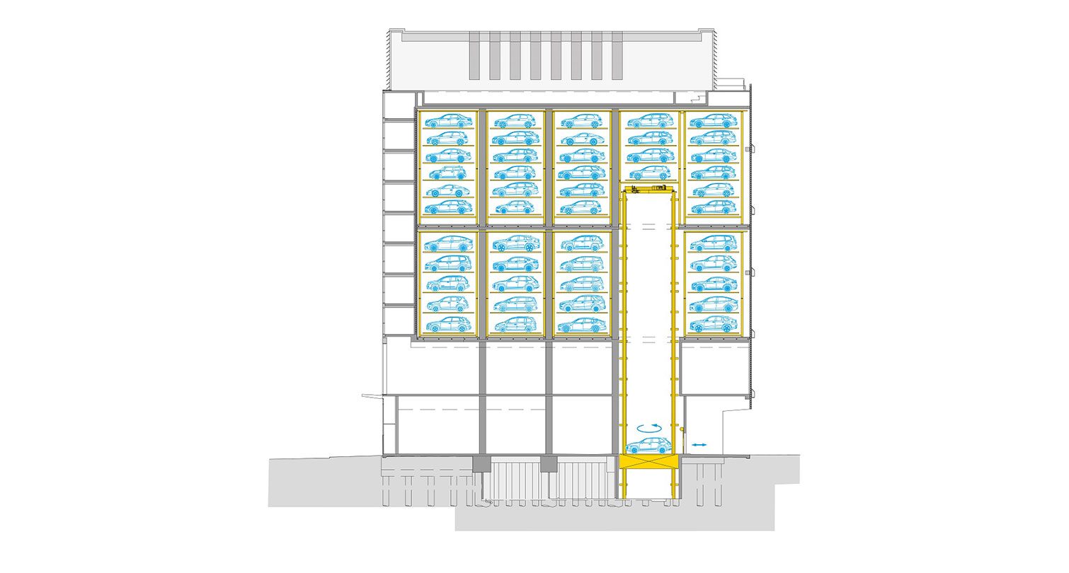 The special of the skytower: Our parking system, which is able to do 30 – 47 parking operations with two transfer cabins. The Multiparker 740 stacks cars with heights between 160 and 200 cm on 11 levels. The complete height of the storage section is approx. 25 m and starts from approx. 12 m above ground level. The parking procedures are operated with a RFID-Chip at the control panel which is located near the transfer area.